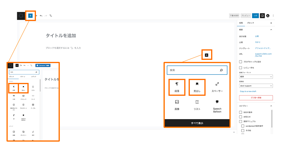 次に見出しと本文は画面内にある「+ボタン」をクリックすると記事に追加できるブロック(記事を構成する単位の呼び方)が表示され、その中に出てくる「見出し」「段落」をクリックして追加します。
