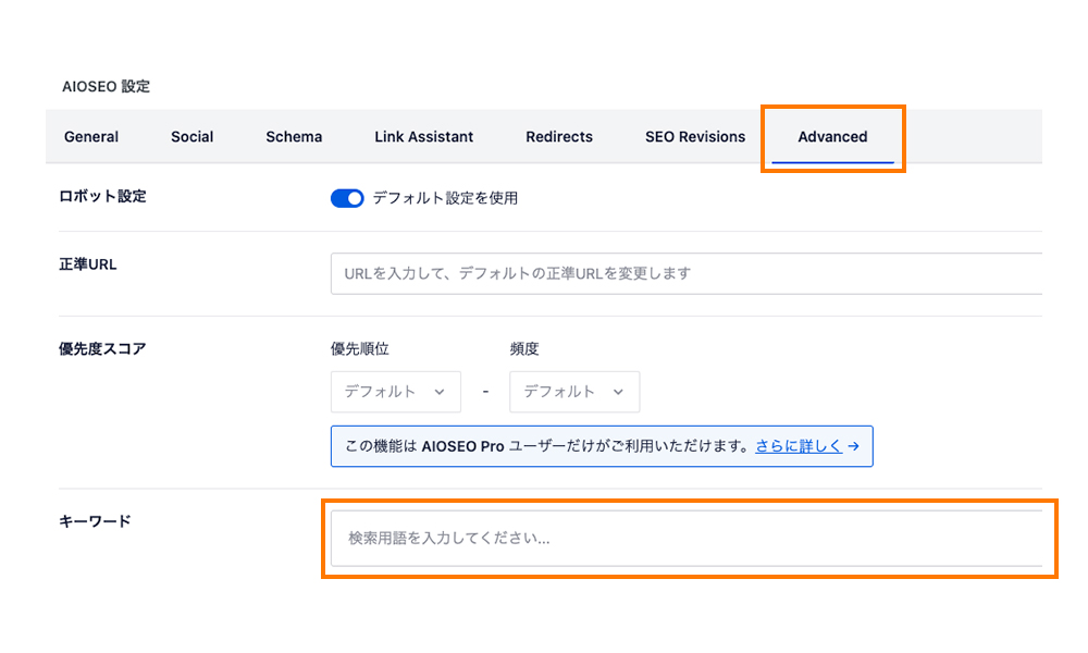 メタキーワードとはそのページ言及している内容を抽象化した単語を2〜3個設定するものです。メタディスクリプションと同じようにAIOSEOの設定の中の「Advanced」のタブを開き、「キーワード」の欄に入力してください。